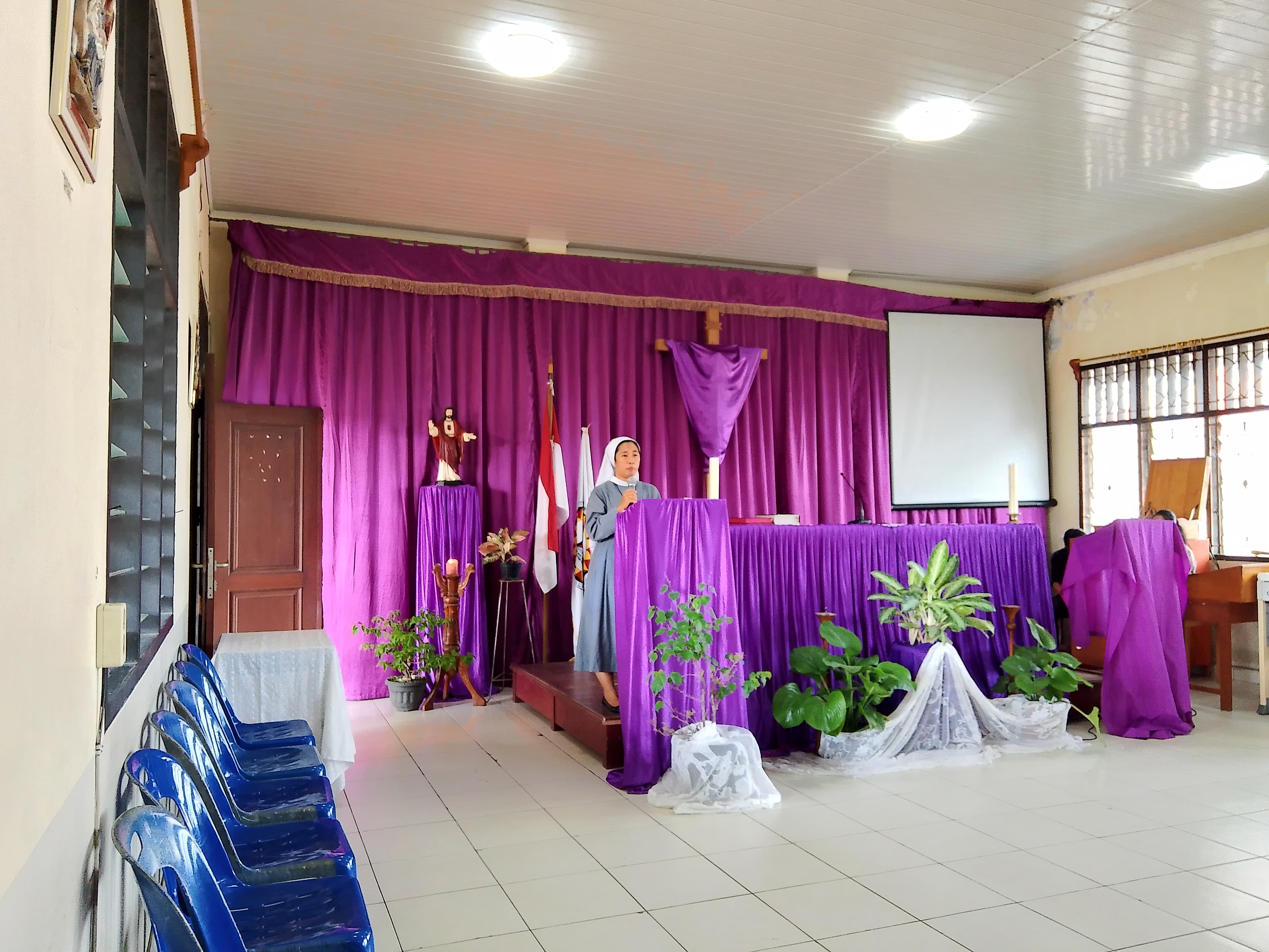 Kegiatan kemudian dilanjutkan dengan ibadat tobat yang dipimpin oleh Suster Aloysia Namo, OSF. Dalam renungannya, beliau mengangkat Injil Lukas 15:11-32 tentang “Anak yang Hilang”, yang mengajak seluruh peserta untuk merenungkan kasih Allah yang tanpa batas serta membuka diri untuk bertobat dengan tulus. Suasana hening dan penuh refleksi semakin terasa saat peserta mengikuti pengakuan dosa sebagai bentuk pembaruan diri.